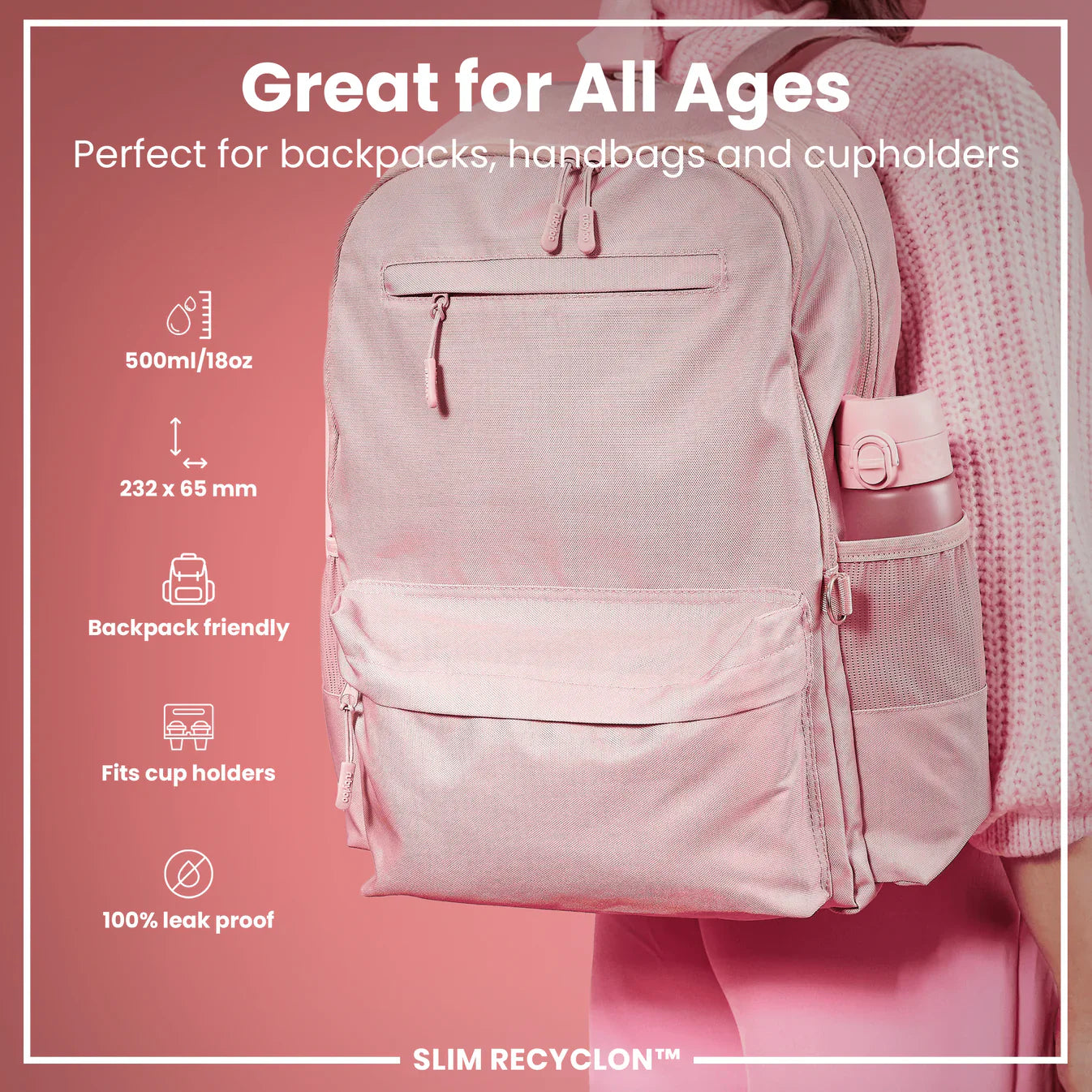 Small enough as a kids water bottle for their school lunch boxes or for smaller bags about town. The width of a soda can, it fits perfectly into all car cup holders and pockets on all backpacks.