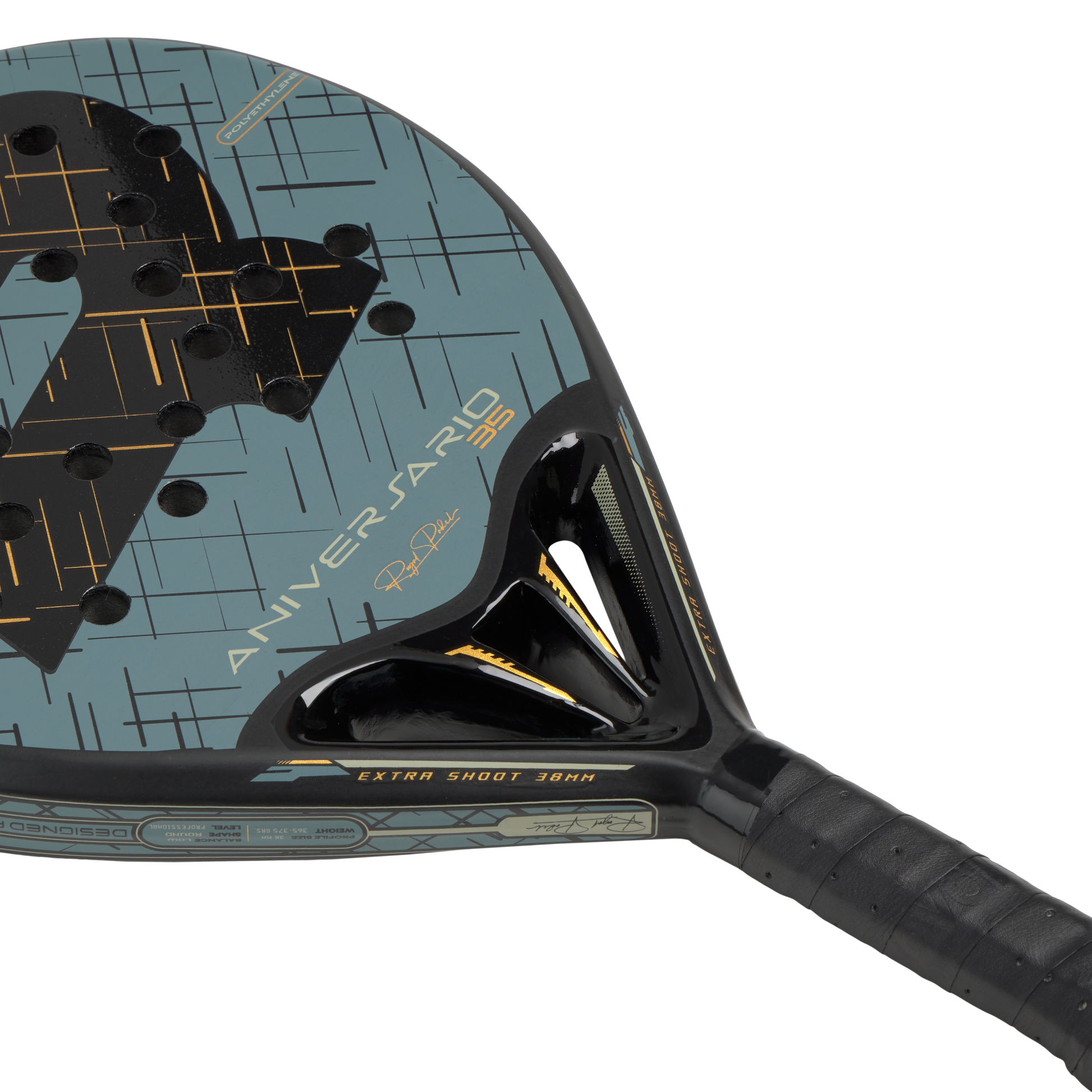Made of soft and highly absorbent Polyethylene inside and Fibertech on its surface, the 35 Aniversario Poly is one of Royal Padel's most comfortable racquets. This year, the frames of the racquet are reinforced with a carbon layer to increase its durability while maintaining the soft touch that characterizes it. The novelty of this year is in the arrangement of holes in the racket. Strategically placed to maintain the large sweet spot of the racquet and the Shock Absorption.